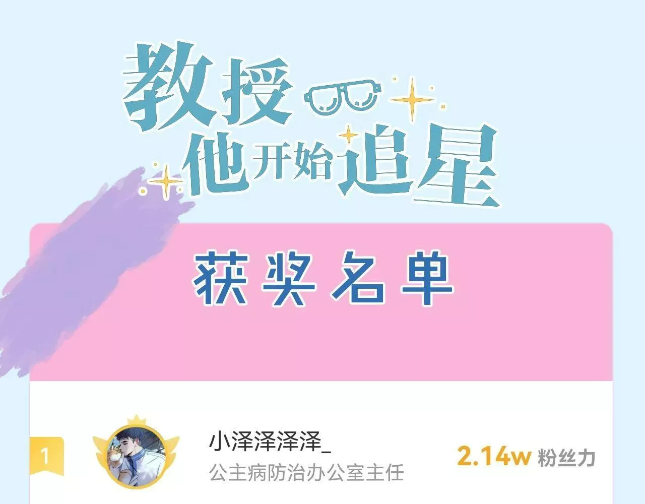 教授他开始追星又名,类型为恋爱的高人气漫画,漫画简介:社交牛逼症小狼狗少爷vs自闭迟钝老干部教授。 付晟屿童星出身,出道后愣是凭借“嘴欠”,“成绩差”,“爱骂脏”等“绝学”成为黑粉繁多的奇葩艺人,经济公司为防止他彻底堕落,强行为他接了乡村校园体验类综艺节...